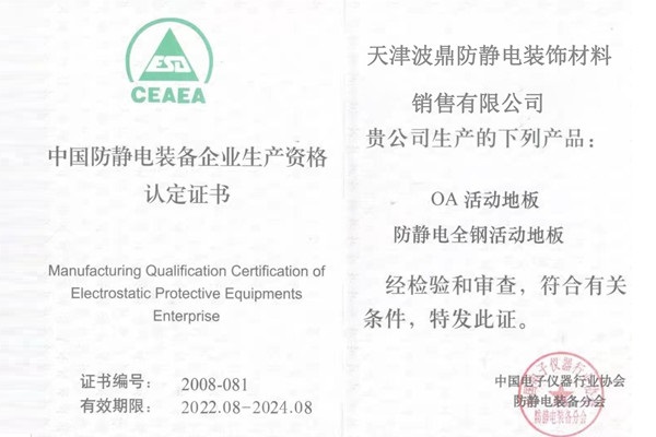 中國(guó)防靜電裝備企業(yè)生產(chǎn)資格認(rèn)定證書(shū)